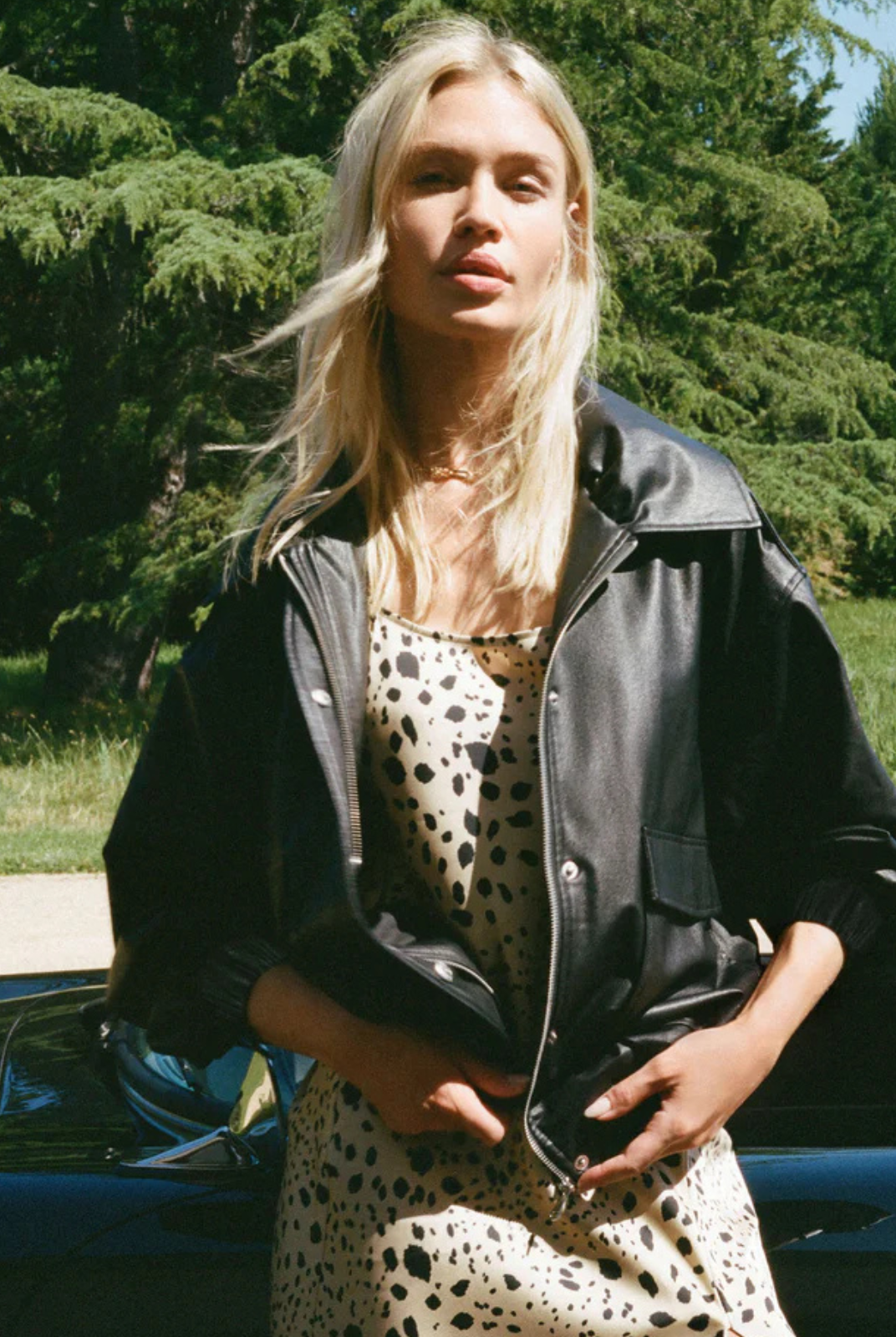 With its collared shape, zip front, and flap pockets, it’s a versatile jacket that pairs with everything from denim to dresses.
