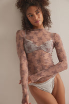 Perfect for layering, this sultry mesh long-sleeve features a two-tone sheer design with floral embroidery, a mock neckline, and thumbhole details.