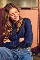 Dark blue denim shirt with western-inspired yoke stitching on the front and back. Designed with a classic collar, button closure, and long sleeves with cuffs. Made in a straight fit from structured denim fabric. The model is 177 cm tall and is wearing a size S.
