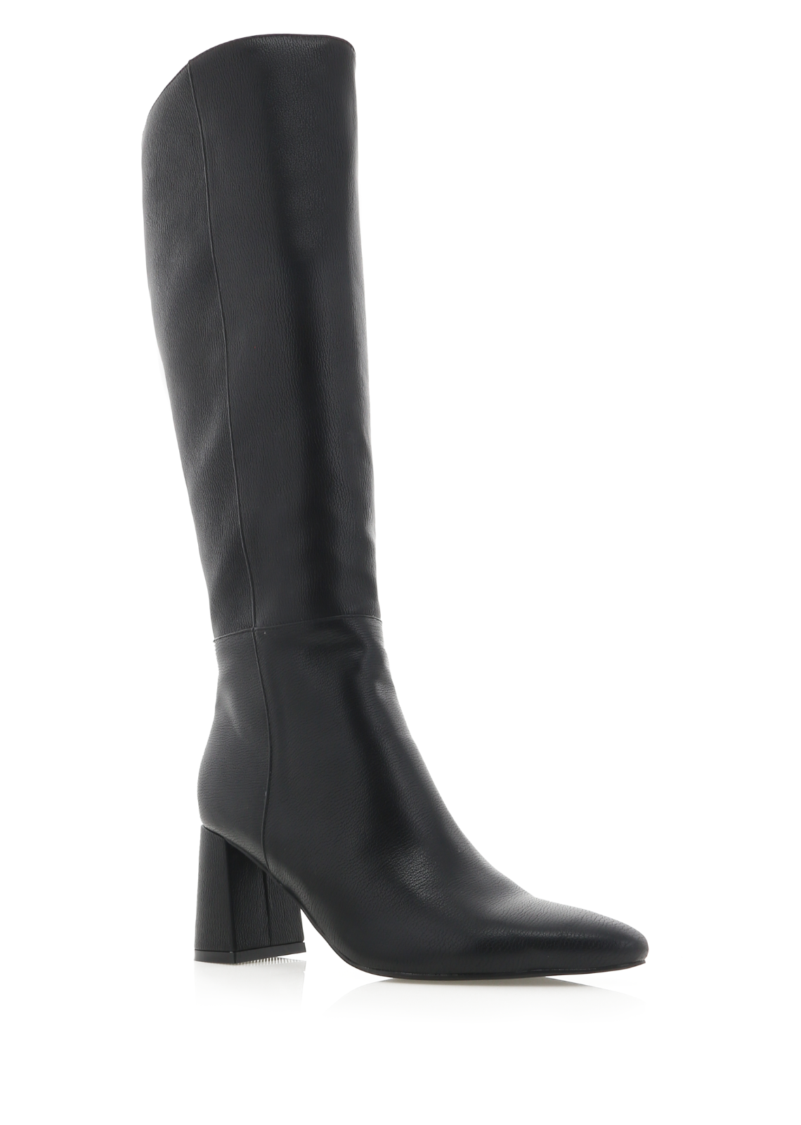 Introducing Maddison, the perfect black leather boot with a knee-length design and high square heel. Step up your shoe game with this versatile and stylish option.