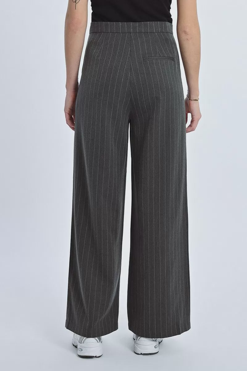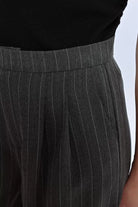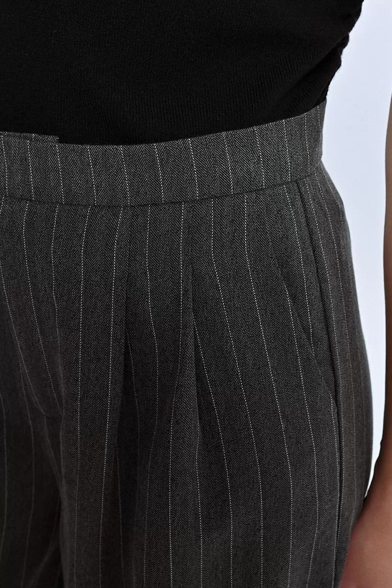 High-waisted dark grey wide-leg striped pants with pleats on the front featuring side pockets, Zip fly and hook closure.