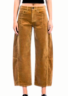 Flatter your silhouette with effortless edge in the VERVET Women's Kate High Rise Barrel Leg Jeans in caramel corduroy. Designed for everyday confidence, these jeans feature a flattering high rise and modern barrel leg fit that adds structure and dimension. Crafted with comfort stretch denim, they offer ease of movement without compromising on style. The cropped length and unique seam detailing give these jeans a fashion-forward touch—perfect for pairing with sneakers or heels.