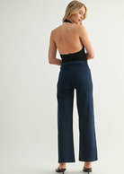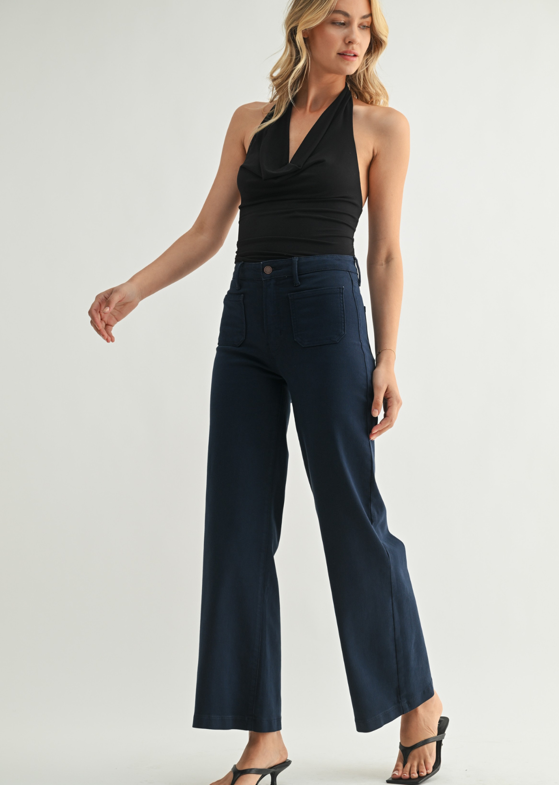 Crafted with a flattering high-rise fit, these navy-colored jeans feature a relaxed wide-leg silhouette for an effortlessly chic look. The mini patch pockets add a unique, playful touch, blending functionality with fashion-forward design.