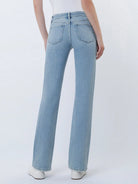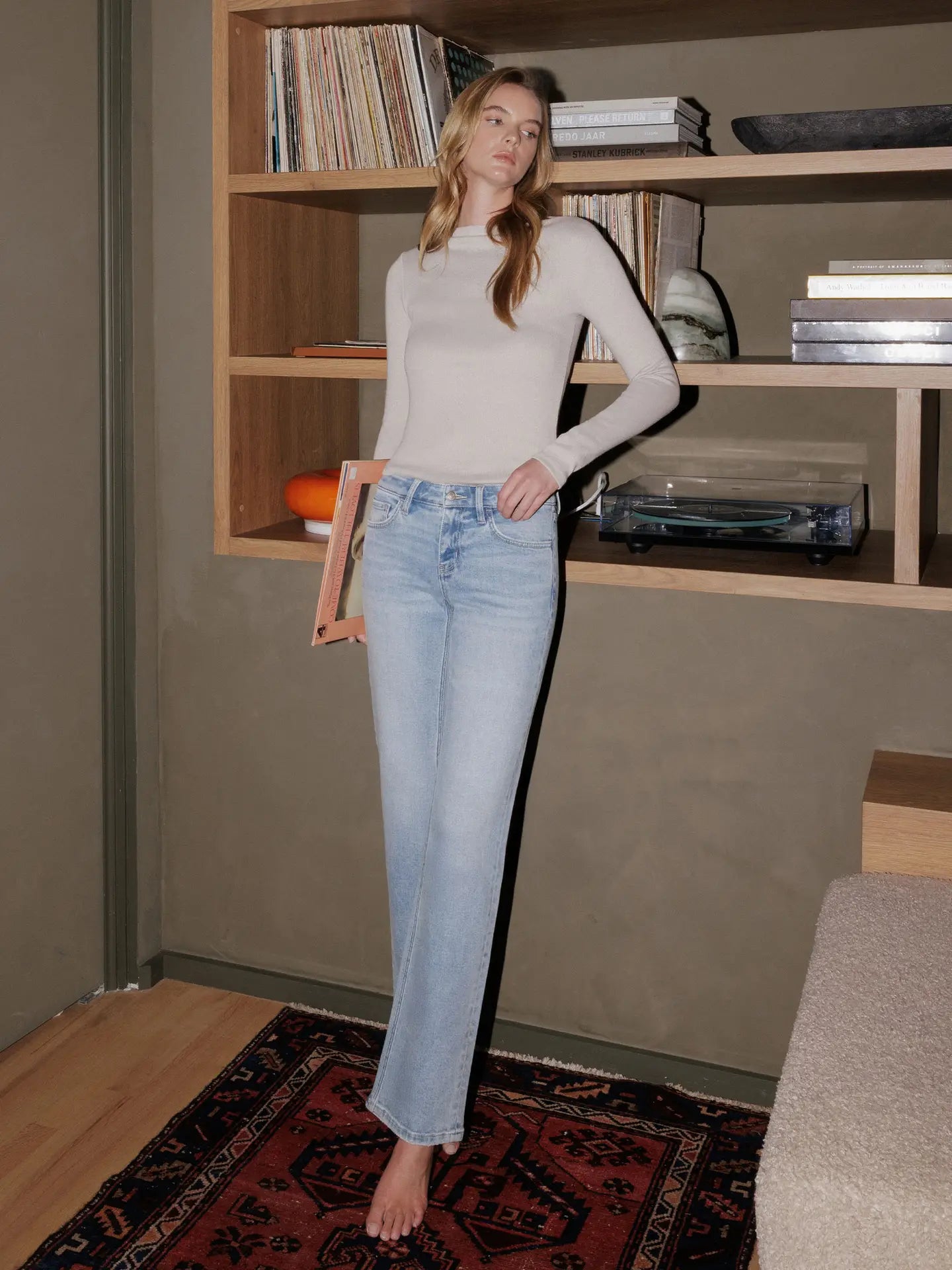 These straight leg jeans are perfect for those who prefer a low-rise jean. They come in a lightwash and are a fuller length on someone who is around 5'7.