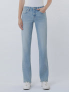 Low rise light wash straight jeans with tint Comfort stretch denim, low rise waist, 5 pockets, finished hem, full length, light wash, straight jeans with tint F. Rise: 8 1/2" / inseam: 31" / leg opening: 16 1/2" Model is 5'10" wearing a size 26