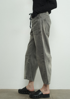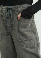 Theses washed-grey jeans are the perfect unique pair featuring a tapered barrel silhouette and slouchy fit. The corded drawstring waist, crop length, deep pockets.
