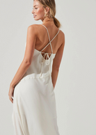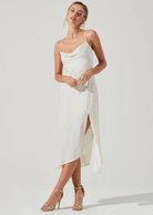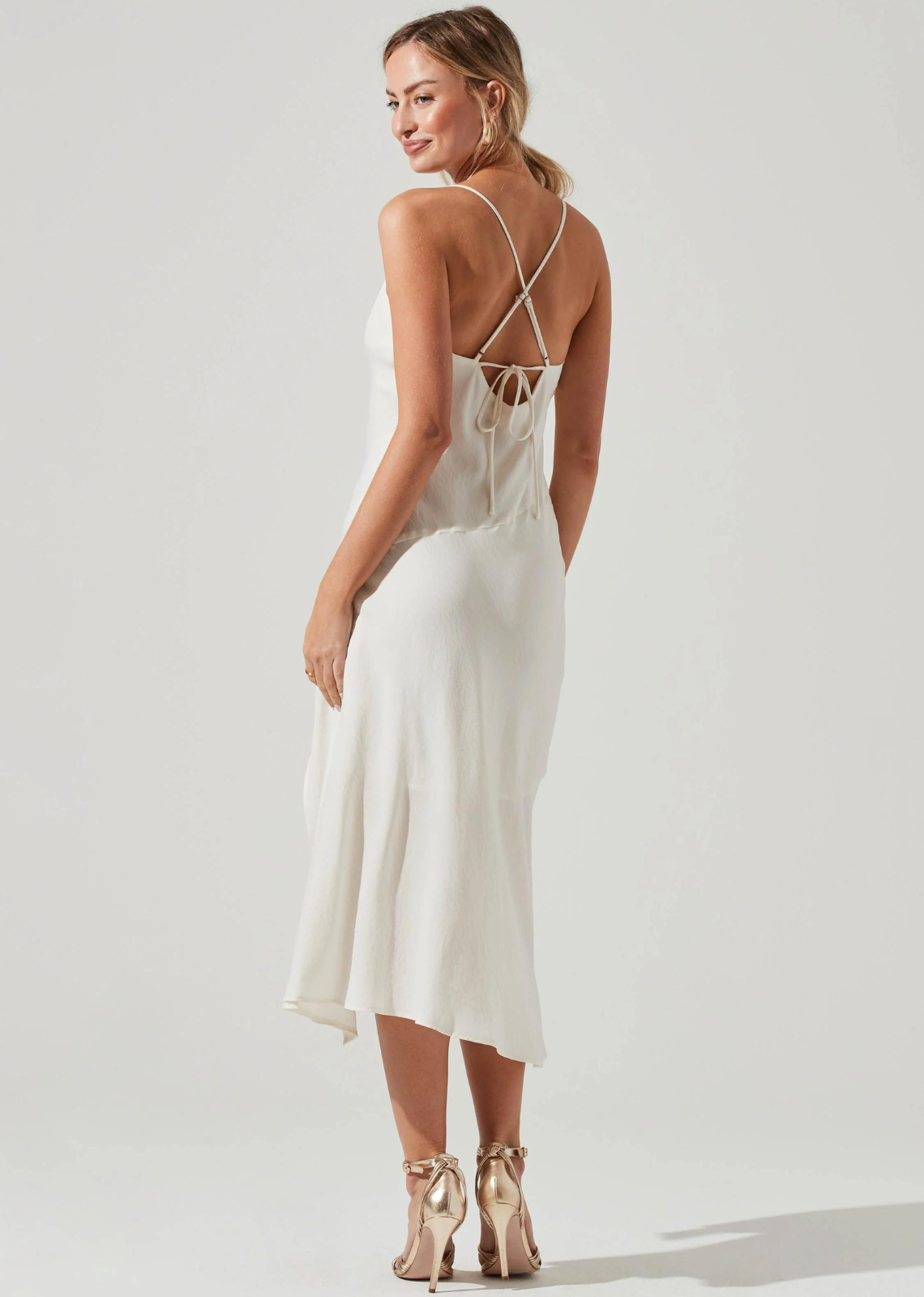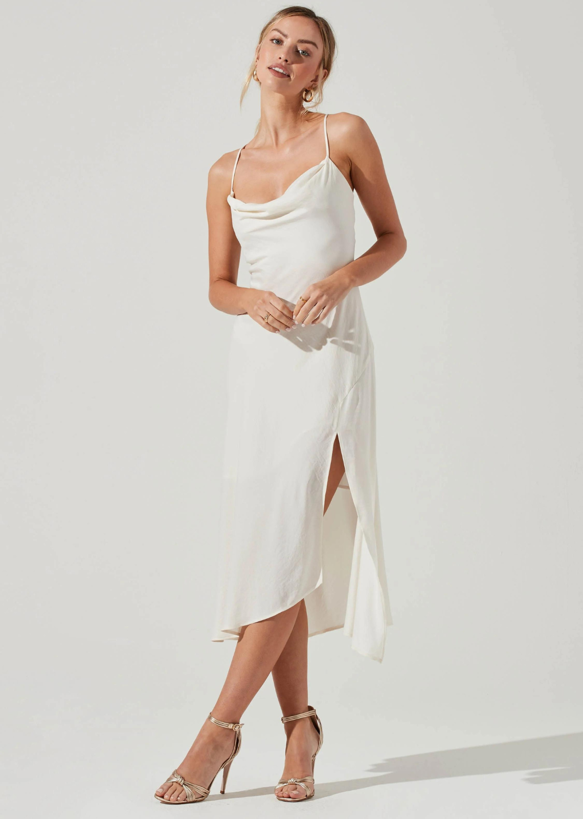 Beautiful cowl neck did dress with low back. Features adjustable straps with a tie closure and an thigh slit.
