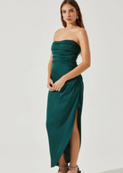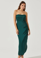 Forest Green strapless dress with Satin finish, pleated bust, ruched skirt with side seam slit, and Concealed side zipper.