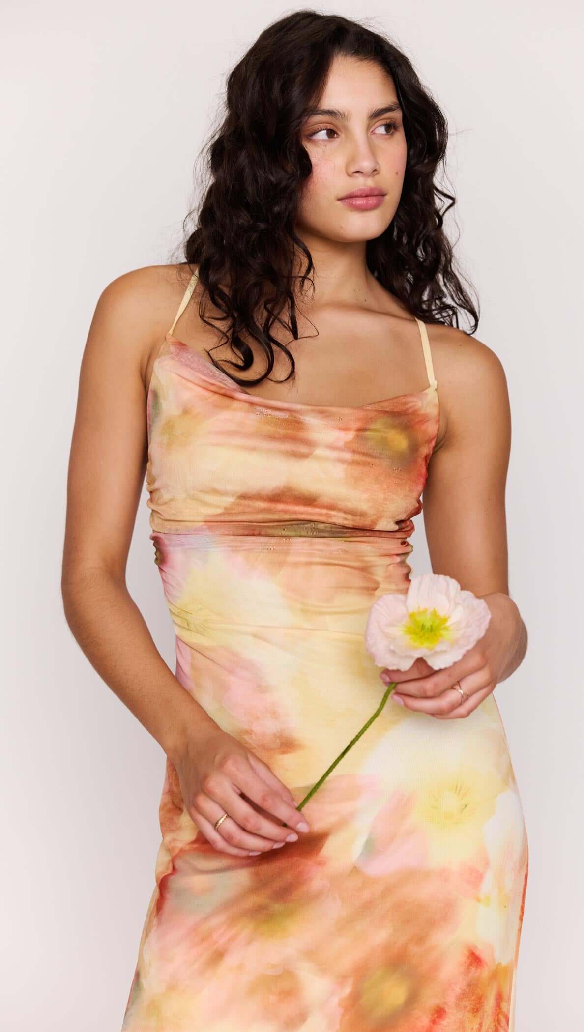 The Sunset Tonal Mesh Maxi Dress is a statement floral maxi designed for effortless occasion dressing. Crafted from soft stretch mesh, this fitted silhouette features a draped neckline, slim straps and an open back with adjustable ties. Finished in a watercolour floral print and fully lined for comfort, it’s the perfect piece for long summer evenings and special events.