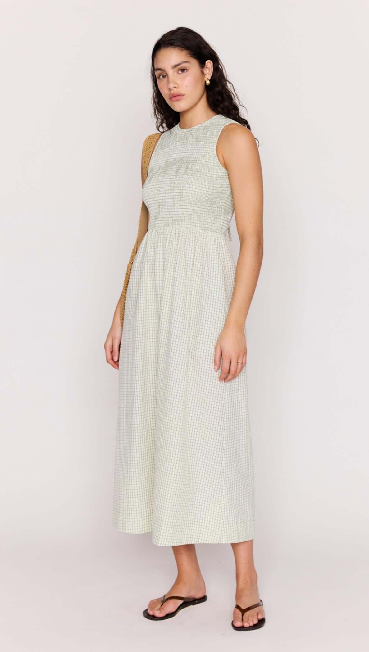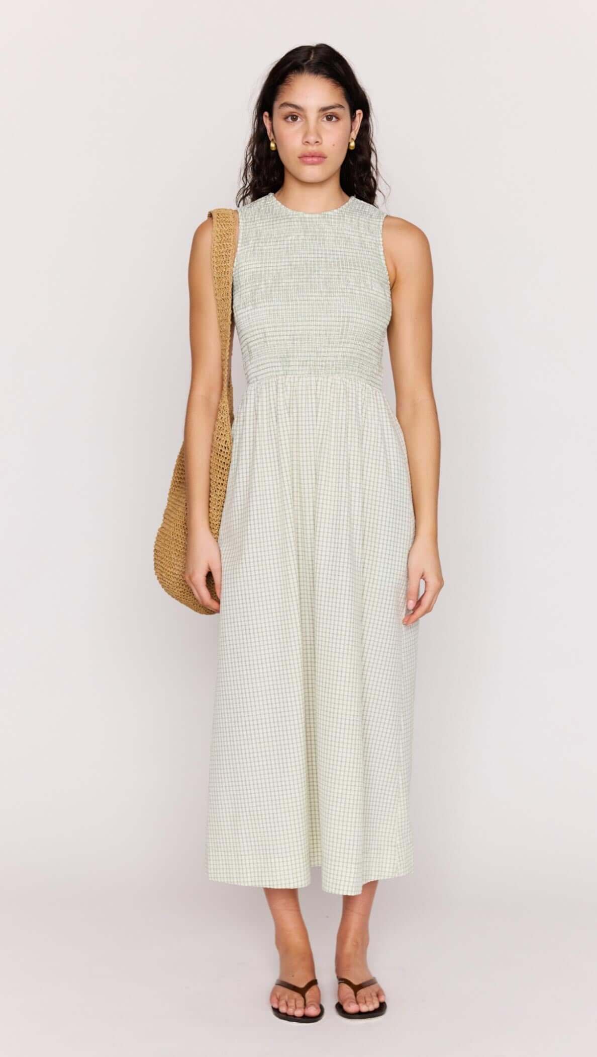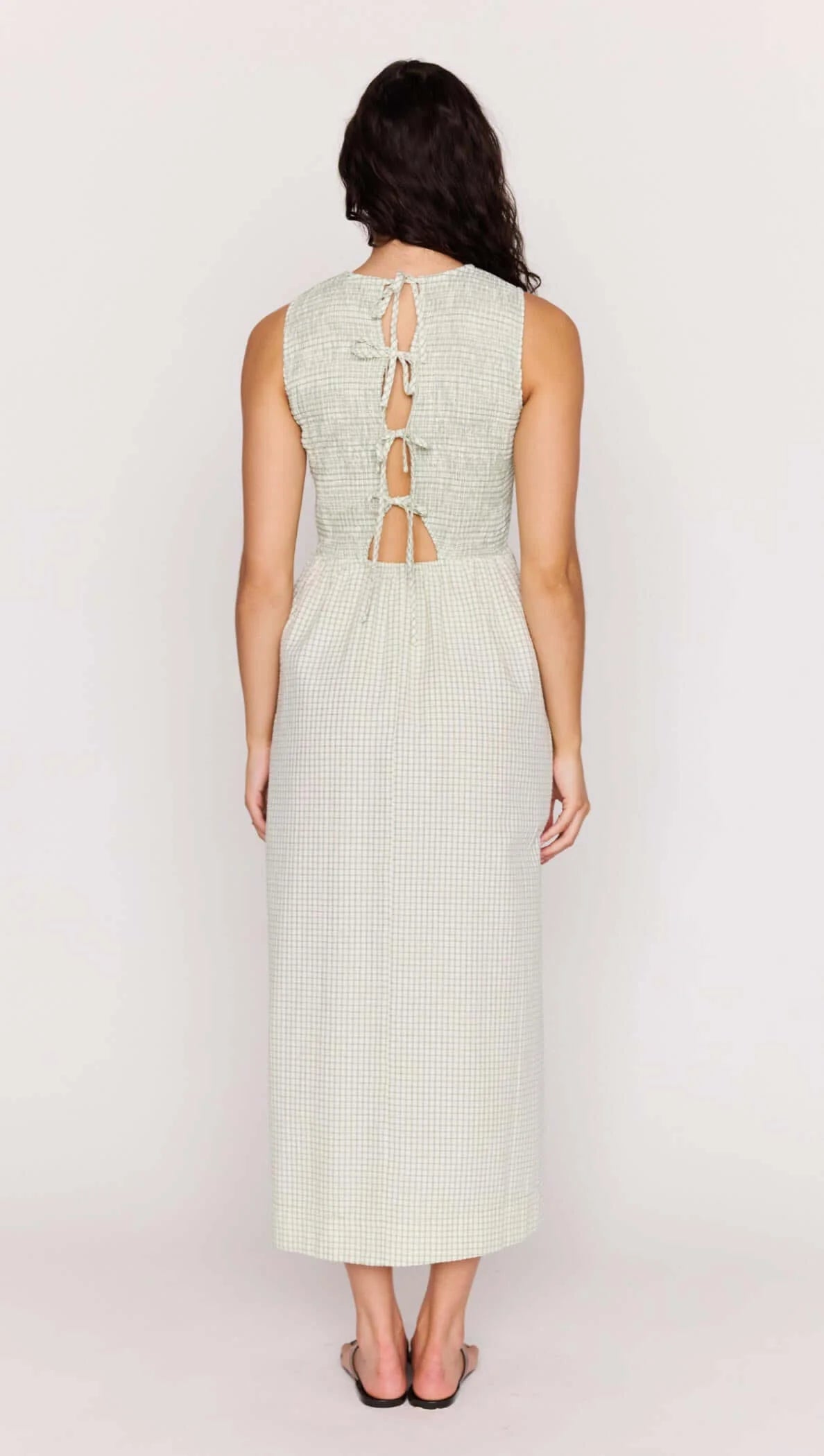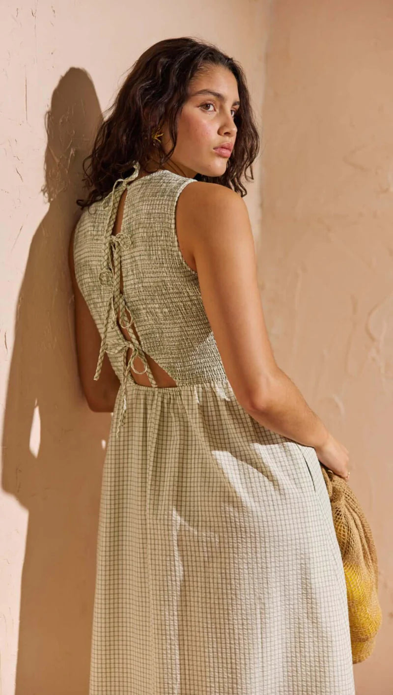 The Sabrina Green Gingham Smocked Midi Dress is designed in textured seersucker with a flattering silhouette that moves effortlessly through the body. Featuring a high neckline and adjustable tie-back detail, this midi dress is perfect for sunny days, weekend plans and warm-weather events.