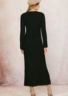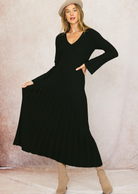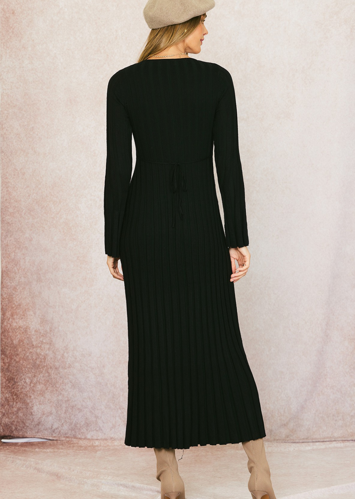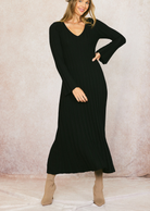 Black ribbed knit long-sleeve midi dress featuring V-Neck dress with a tie waist, slight bell sleeve, a-line skirt.