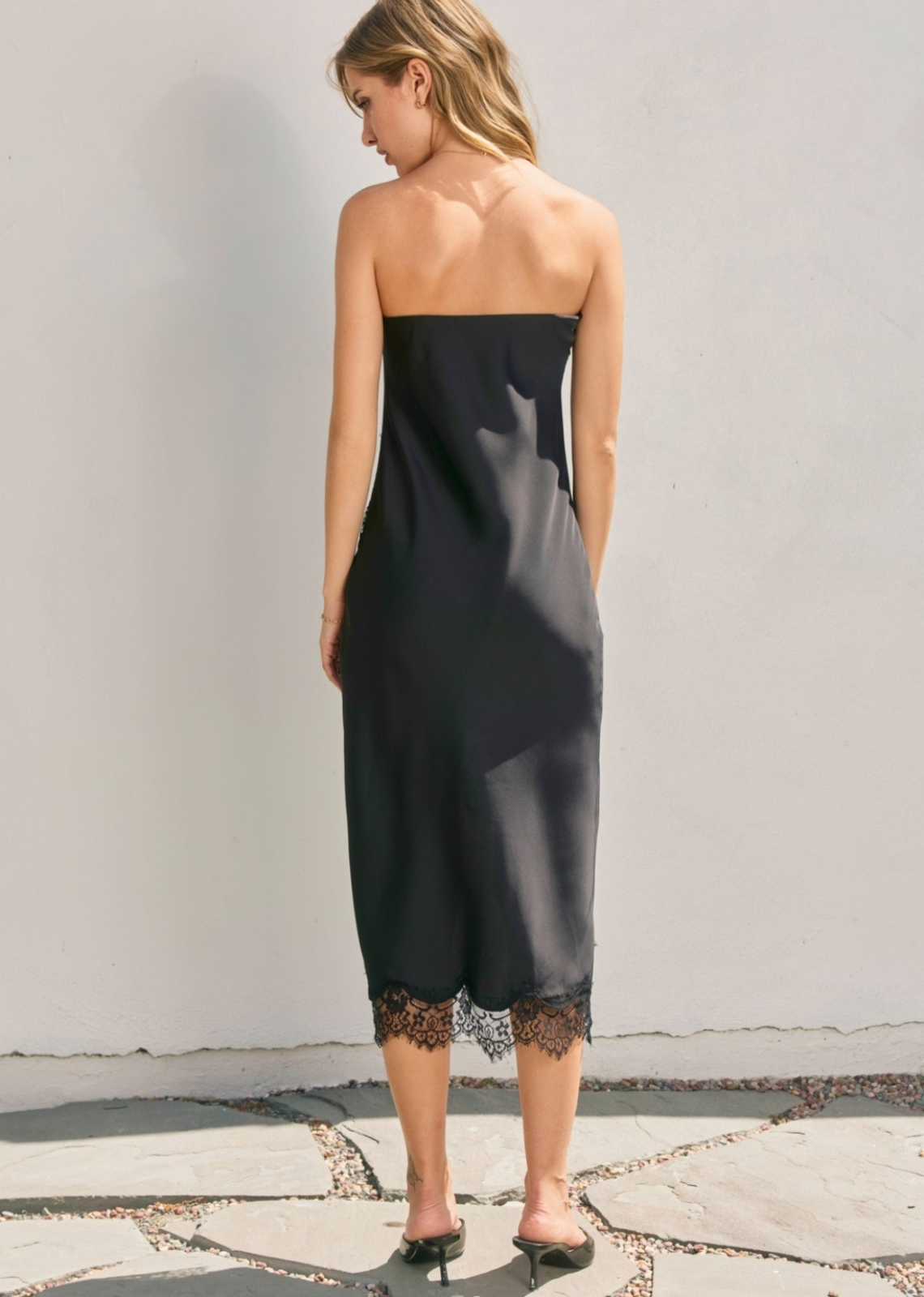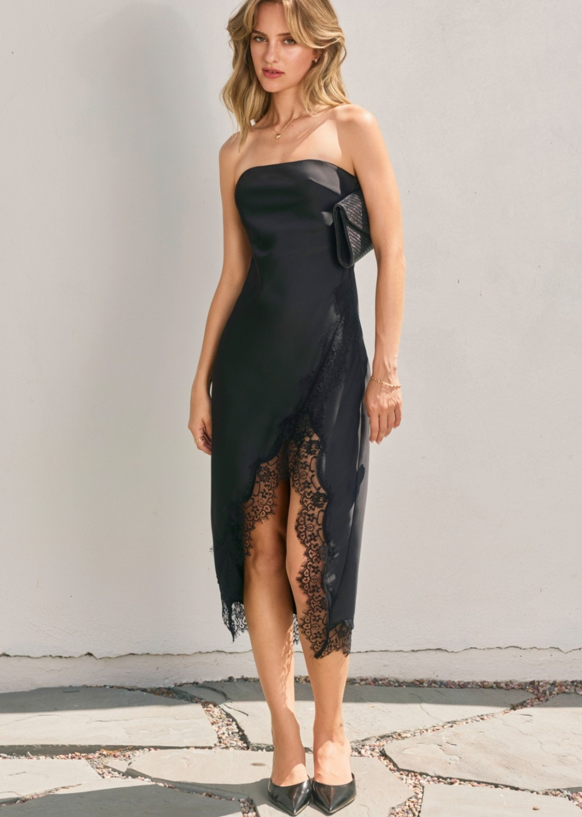 Black tube midi dress with asymmetrical wrapped lace edge that is lightweight, silky, yet quietly dramatic. Elegant and flattering, this dress is perfect for parties and special occasions.