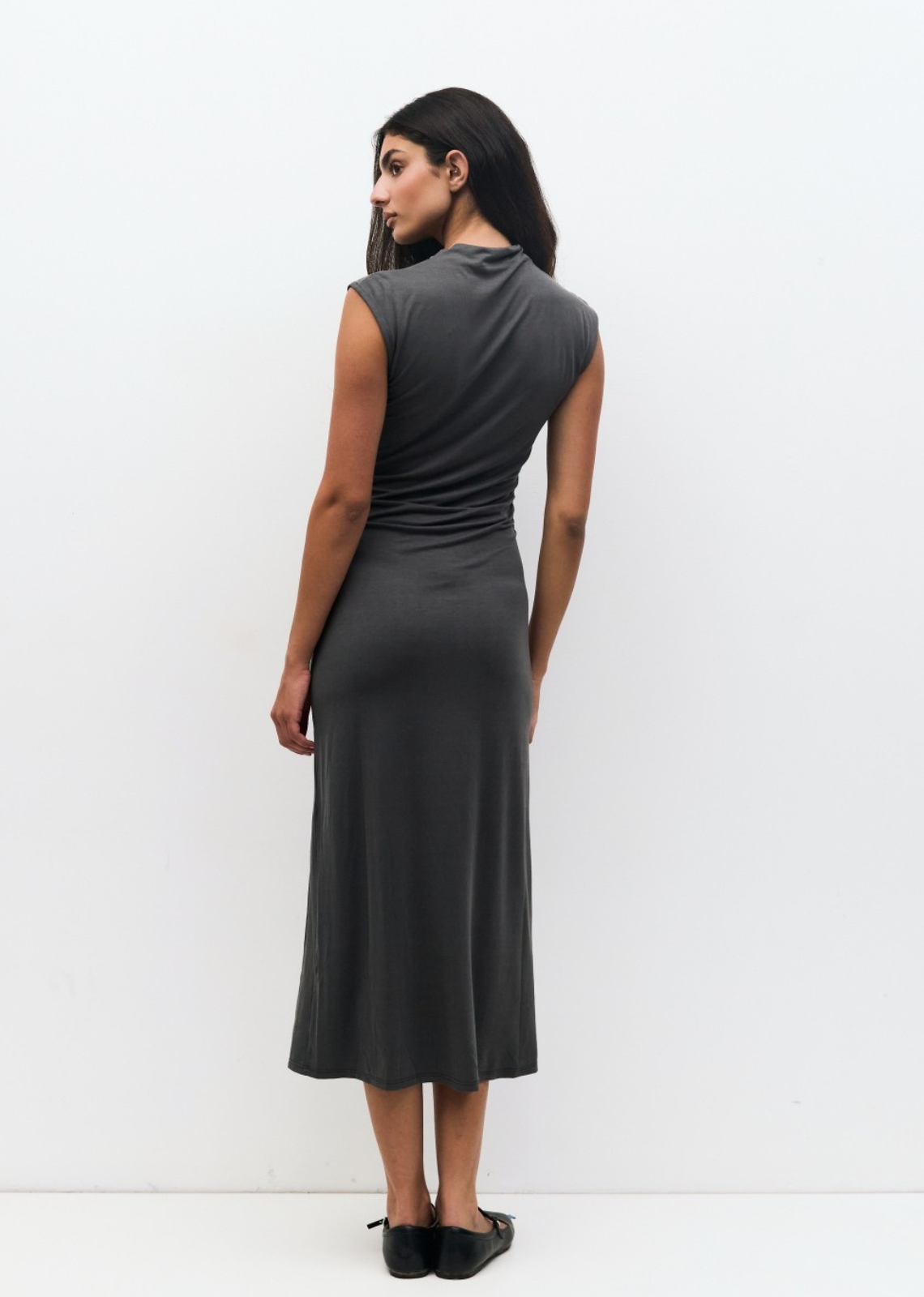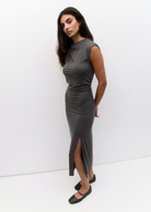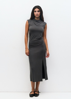The Felicia Dress is a sleek, body-con maxi crafted from a soft, lightweight knit. Designed with side-front shirring for a flattering shape, it features a sleeveless cut, cowl mock neck, and a subtle front slit for added movement.