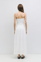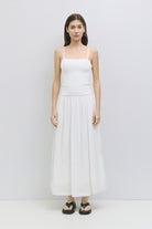 The Hudson Dress is a flattering midi tube dress with a ribbed knit top and adjustable straps. The fully lined woven skirt adds a touch of sophistication, making it a go-to piece that transitions seamlessly from day to night.