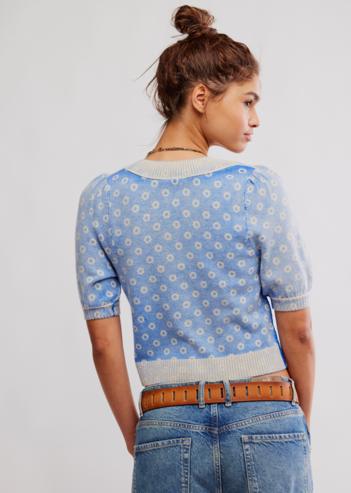 Sweet and so classic, this knit cardi is featured in a cropped style with puffed short sleeves and contrasting buttons down the front.