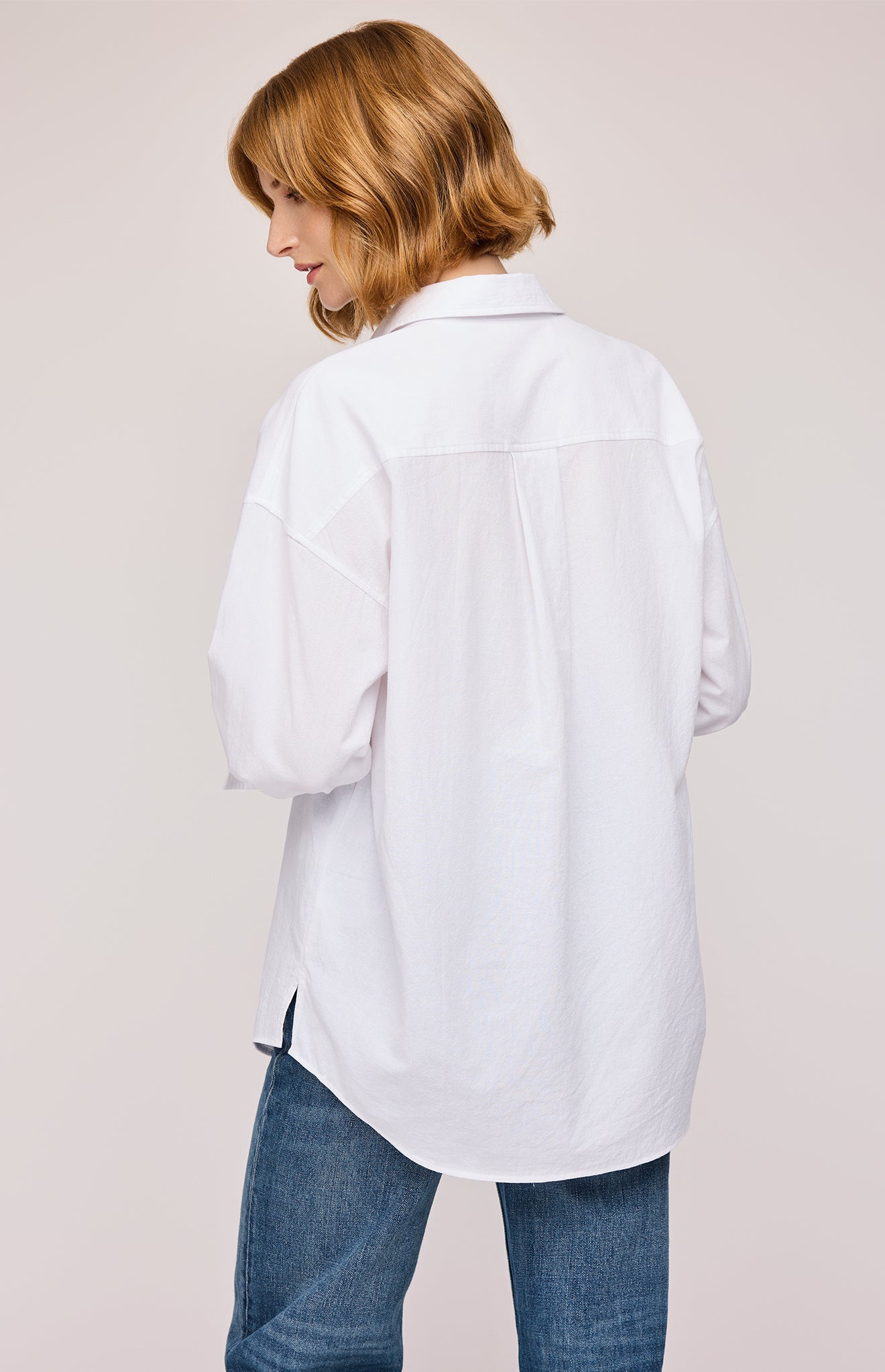 The Callahan button-down shirt is made of a cotton poplin fabric with a light crinkle texture. Features include a patch pocket and side slits.