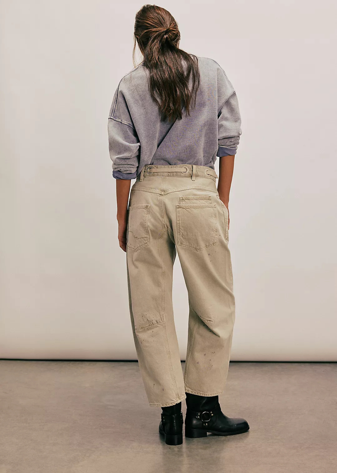 Features: Distressed detailing throughout, paint splatter features, oversized patch pockets, contrast drawstring waist, pull-on style