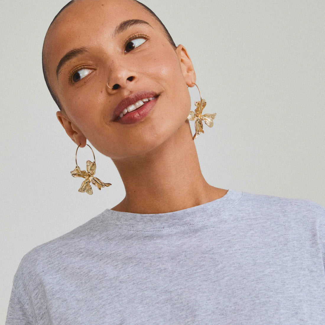 Let nature embrace you! The gold-plated DREAM hoops from Pilgrim are the standout piece of the season. These sleek hoops with large flower pendants offer a distinct, opulent bohemian style. The floral design may also be perceived as a stylish bow, giving your summer wardrobe a playful edge. With a genuine summer vibe, they're excellent for accentuating your personal style effortlessly yet impactfully. Style them with high-waisted shorts and a cropped top, or pair them with a flowy dress for a fresh and cool look. The earrings are crafted from 99% recycled materials, allowing you to shine with a clear conscience.