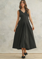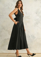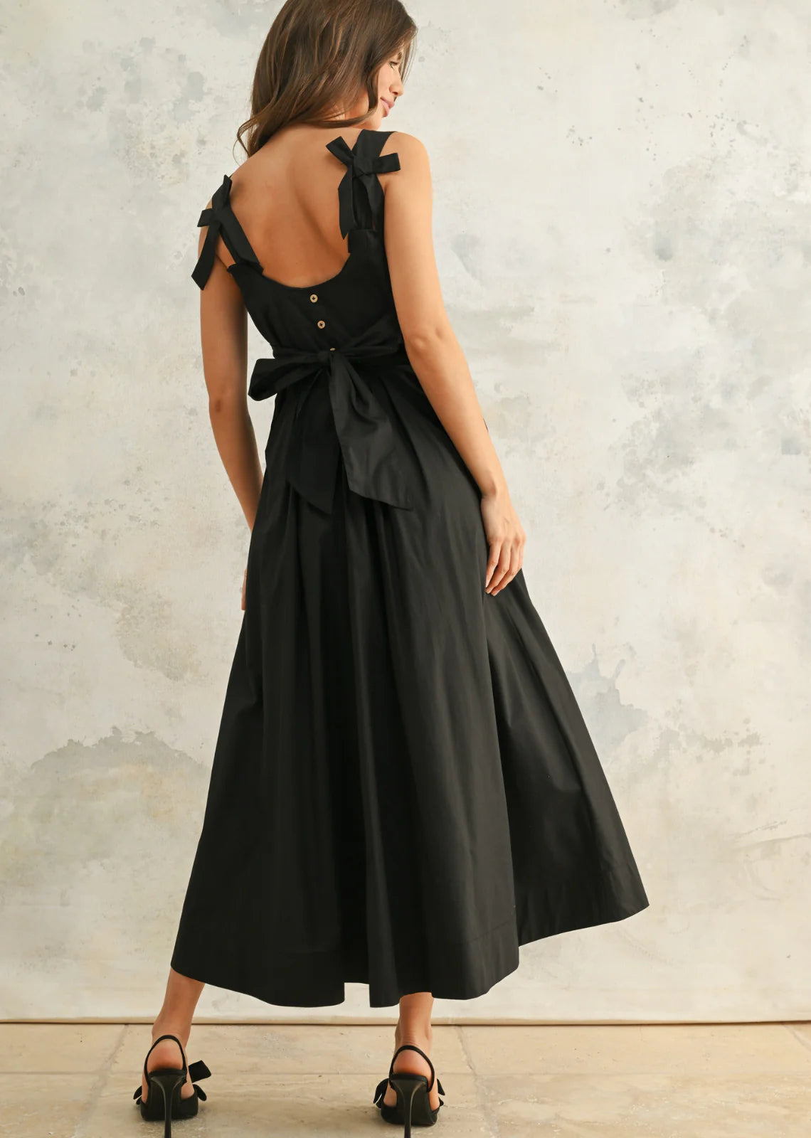 Adorable black midi dress with a tie bow back, andn bow details on the straps. Button up details on the back.