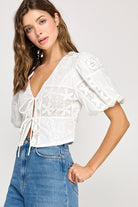 This ivory blouse features a flattering V neckline and short bubble sleeves for a soft romantic silhouette. The front has tie closures while delicate eyelet embroidery and embroidered patchwork add texture and charm. Lightweight and breathable it is perfect for everyday wear or vacation looks.