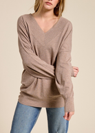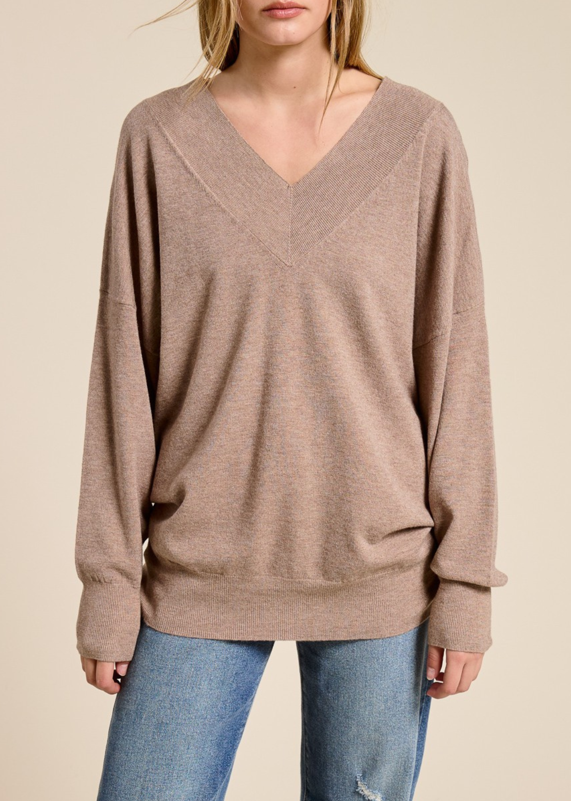 Elevate your wardrobe with the refined elegance of our Deep Double V-Neck Cashmere Blend Top. Crafted from a sumptuous cashmere blend, this top delivers unparalleled softness and lightweight warmth. The striking double V-neckline adds a modern, architectural touch, creating a flattering frame that's perfect for layering or wearing on its own. With its relaxed fit and fine-knit texture, this piece effortlessly transitions from cozy days at home to chic evenings out-combining comfort with timeless sophistication.