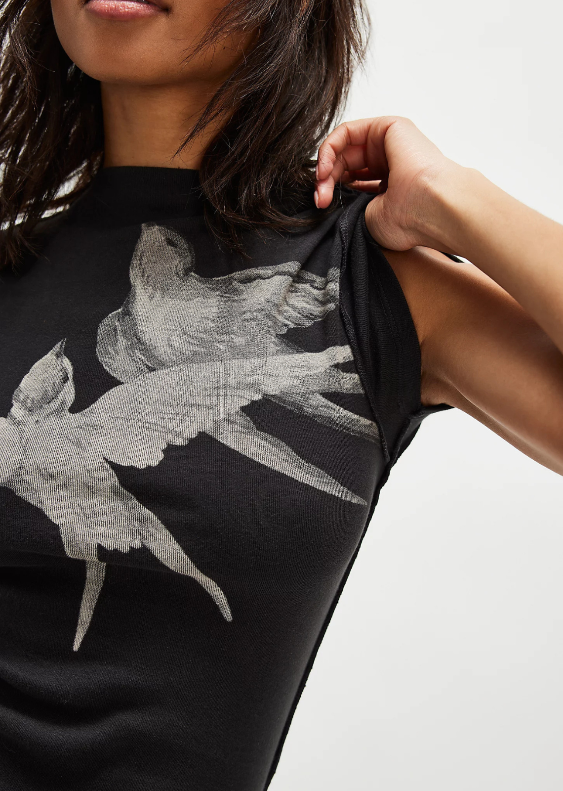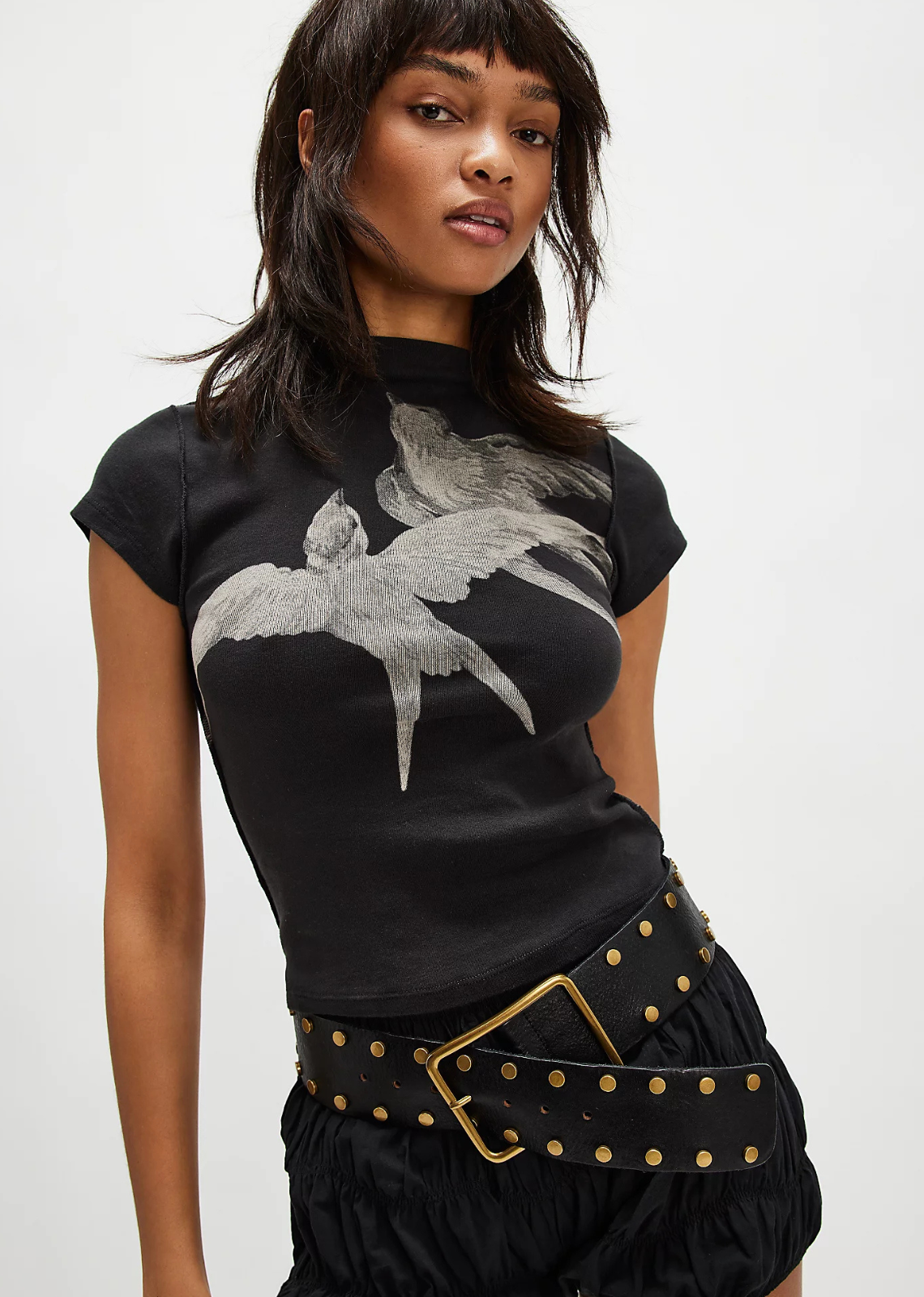 A stunning bird graphic transforms this basic baby tee from Ragabond from staple to statement.