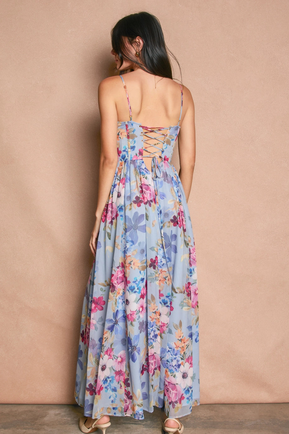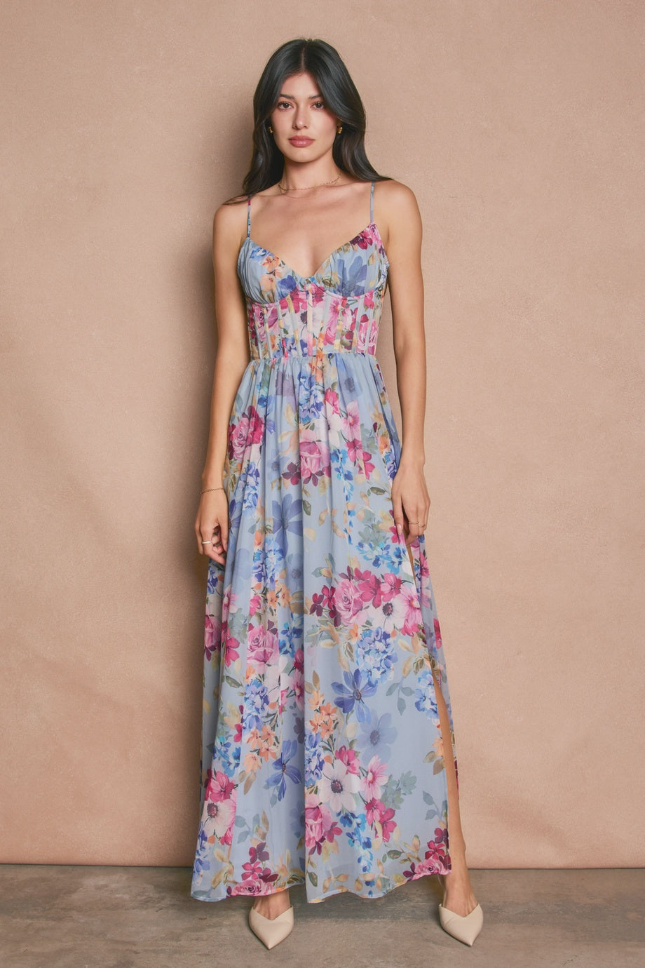 This stunning floral print chiffon maxi dress features a romantic silhouette, corset bodice and a flowy skirt. |
