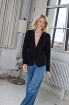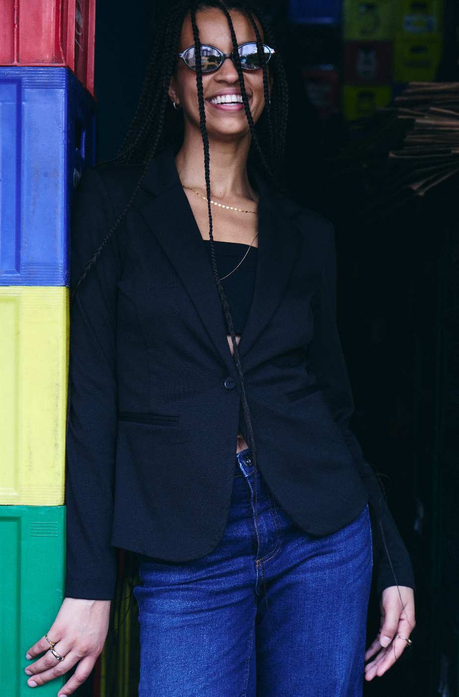 Tailored blazer with a striking allover geometric pattern, single button closure, notched lapels, and slim fit. Features front flap pockets and long sleeves for a sharp silhouette.
