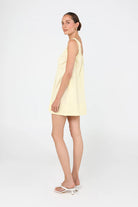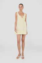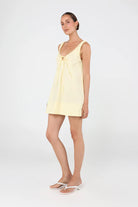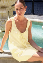The Yellow sleeveless cotton mini dress with a scoop neckline with fixed gathered feature and a centre front key hole with tie.
