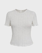 A fresh take on a wardrobe essential, this white tee features a classic silhouette with delicate pointelle texture throughout and a ruffled hemfor subtle, feminine detail. Lightweight and versatile, it’s perfect for layering or wearing on its own for everyday style.