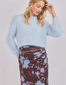 This fuzzy powder-blue sweater is sure to keep you warm during the colder months! It features stunning shimmering silver threads that will make you the star of any room you walk into, subtle balloon sleeve with cuff and a boatneck.
