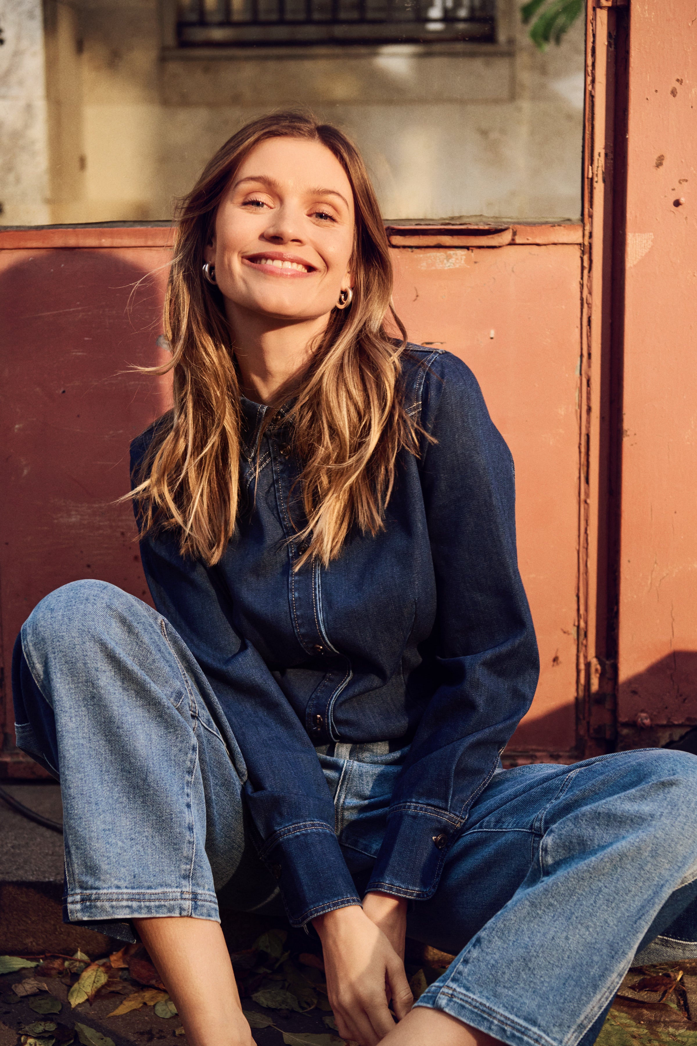 Dark blue denim shirt with western-inspired yoke stitching on the front and back. Designed with a classic collar, button closure, and long sleeves with cuffs. Made in a straight fit from structured denim fabric. The model is 177 cm tall and is wearing a size S.