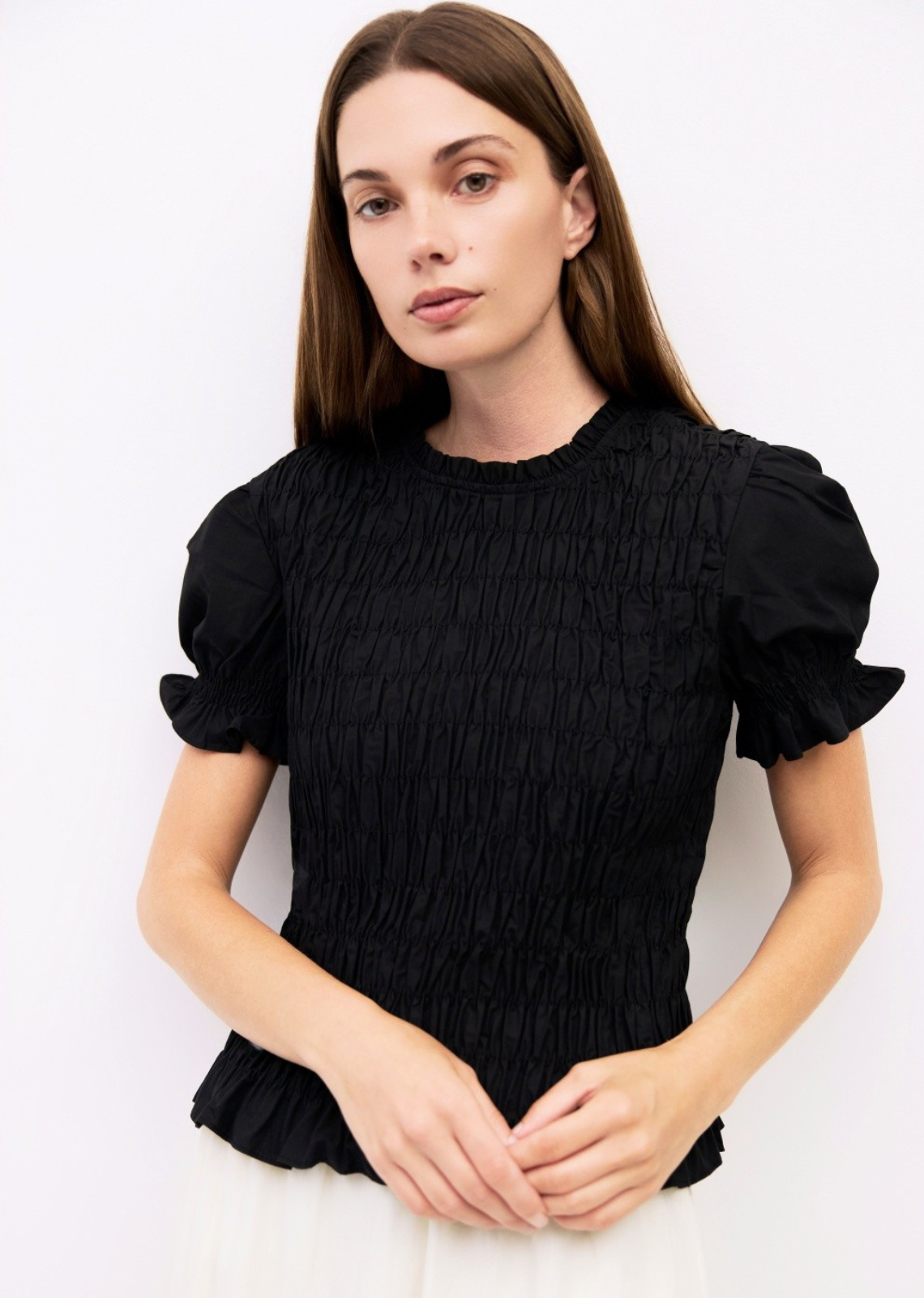 The Bristol Top is a form-fitting blouse made from smocked midweight cotton with puff sleeves. It features ruffled details along the cuffs, neck, and hem, plus a crewneck and back keyhole button closure. A delicate and structured blouse with subtle texture.