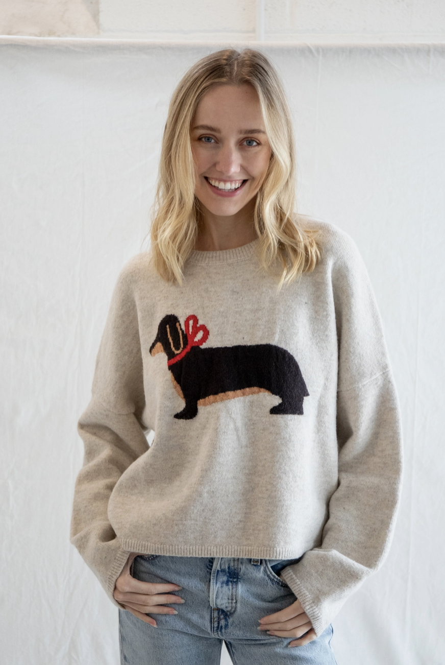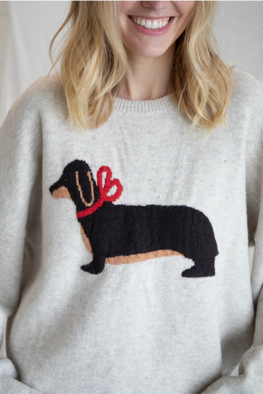 Cozy knit sweater features an adorable pup illustration topped with an red bow—because style should never take itself too seriously. Made from a soft, midweight knit that’s perfect for layering through cooler months.