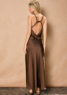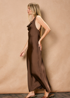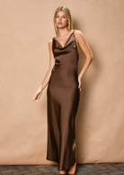 Satin maxi dress with a cowl neck and open back with twisted cord shoulder straps.