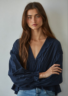 woven Lyocell Cotton Eyelet Collar Plunged V-Neck Button Down Long Sleeve Blouse Top With Lace Trim Detail