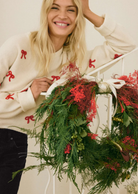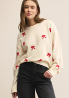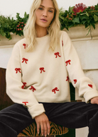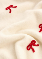 Finished with delicate bow embroidery across soft yarns, its relaxed fit makes it the perfect festive layering piece.