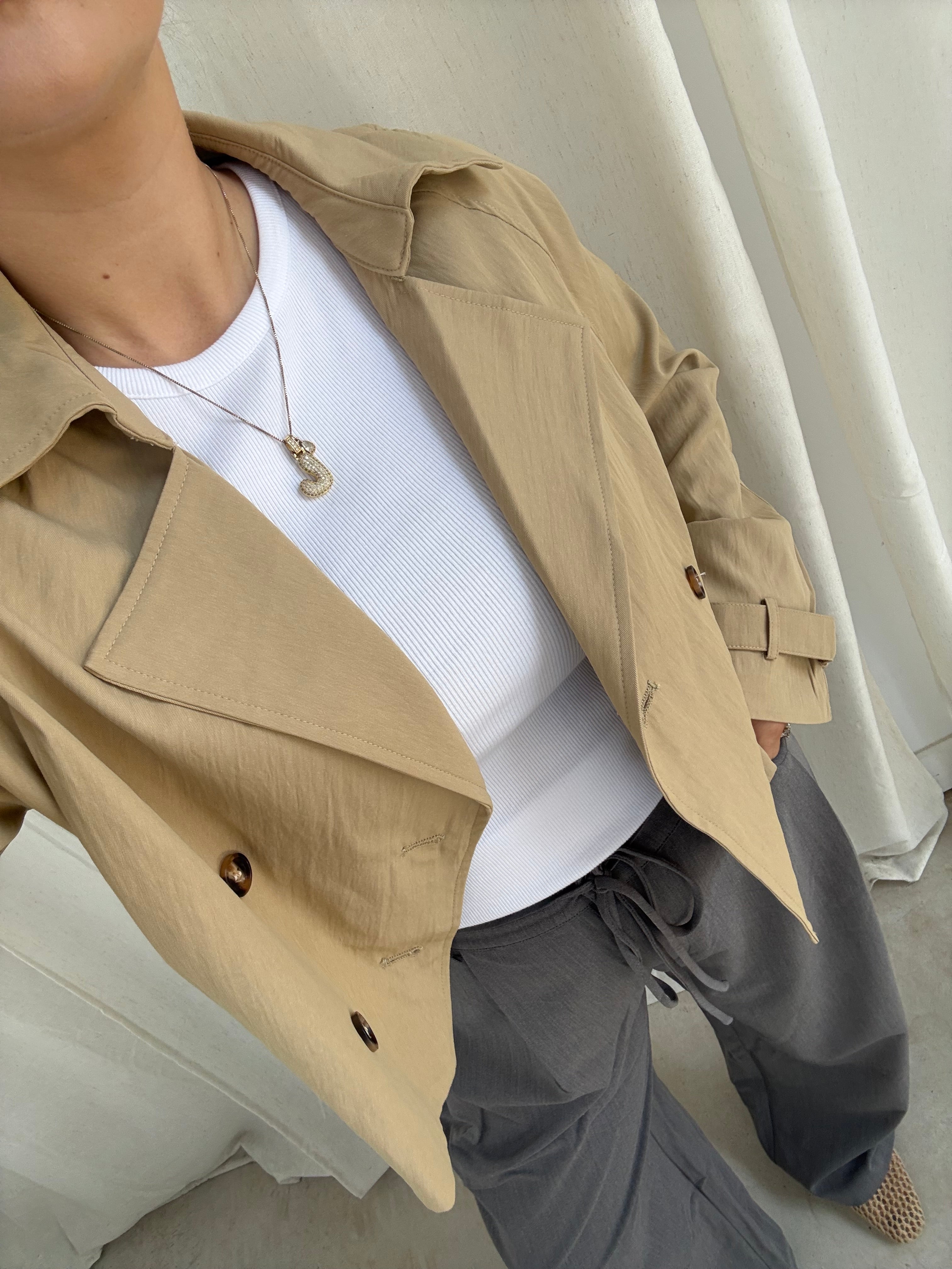 Person wearing a beige trench coat in front of a white curtain