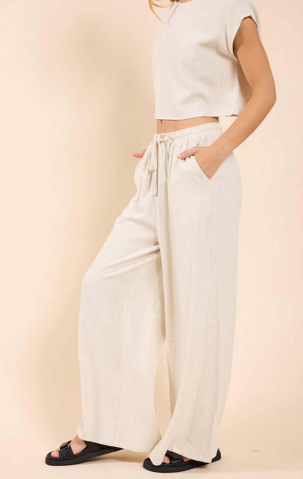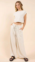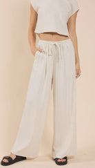 Sadie & Sage's Sugarloaf Elastic Linen Pants are the perfect combination of style and comfort. These best-selling pants feature a drawstring waist and pockets for added convenience. Made with high-quality elastic linen, they are perfect for any occasion and pair seamlessly with the matching top. Experience the ultimate in style and functionality with these essential wardrobe pieces.