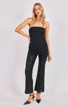 This strapless jumpsuit is everything you need for a fun statement moment this holiday season. Can't decide between a little black dress or a pair of sparkly pants? Wear them both! This one piece has smocking in the back for stretch and comfort while the pants offer you the perfect combination of lace and sequins.