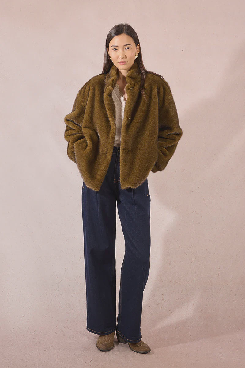 Medium brown faux fur jacket featuring tightened cuffs, stand-up collar, and rhinestone hook closure.