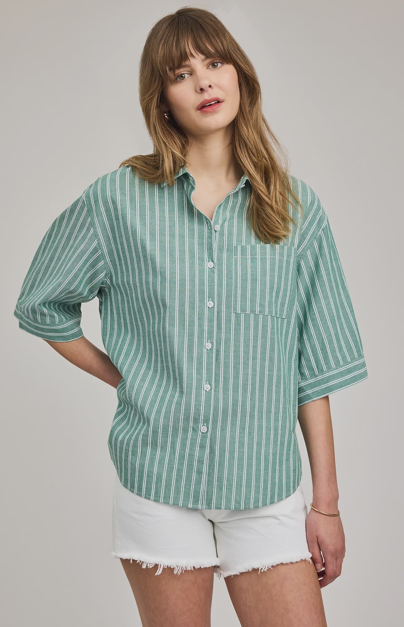 The Blaire button down shirt is made of a cotton poplin with a yarn-dyed stripe. Features include a patch pocket and side slits. Complete the look with the Lima short.