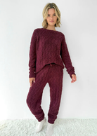 Elevate downtime with this Fuzzy Cable Knit Sweater PJ Set. Crafted from fuzzy chenille yarn, it features a dimensional cable stitch on a relaxed-fit sweater top for an extra touch of texture and style. We added a comfy elastic waistband with an adjustable drawstring and elastic cuffs to the matching pants for an extra comfy fit. Cute and comfy, this set is perfect for lounging and lie-downs alike.