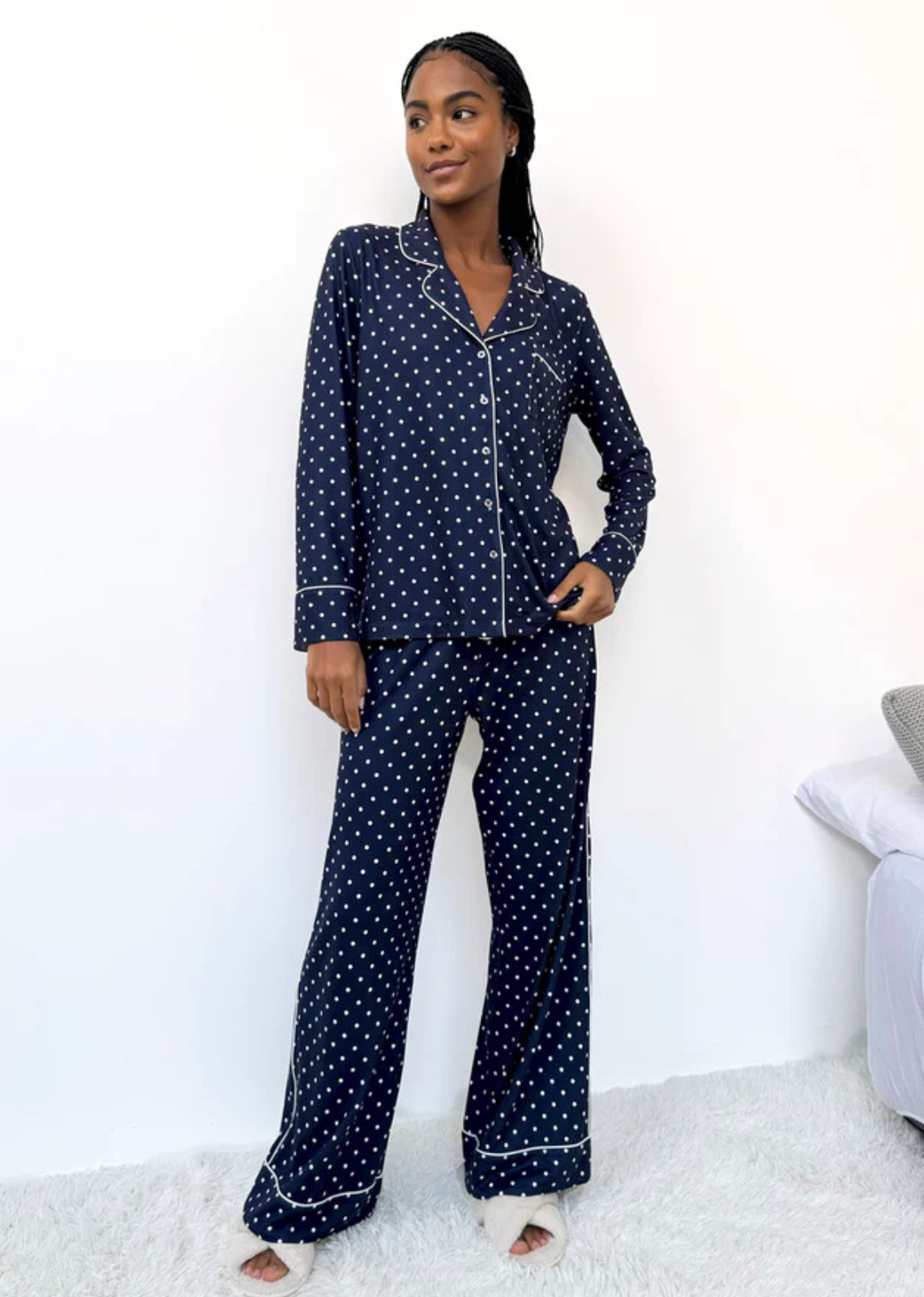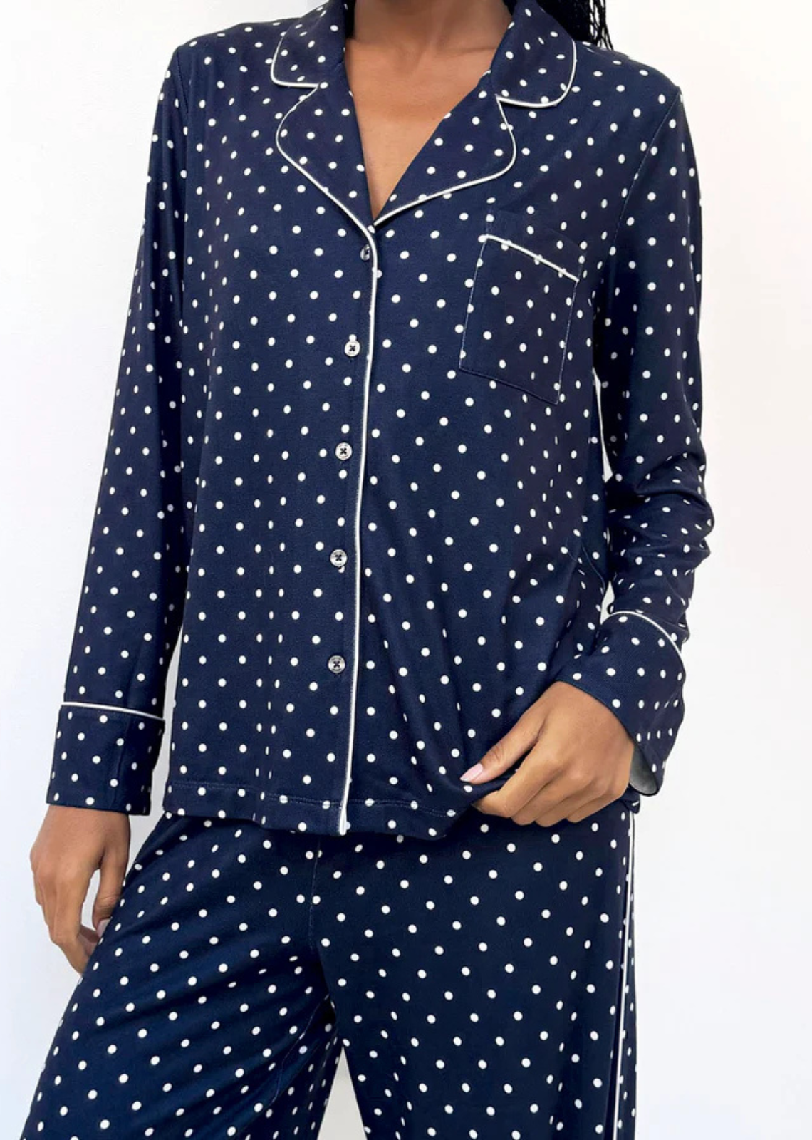 From your evening skincare routine to a restful slumber, this sleep set has you covered. Made from our brushed-for-softness Pillowsoft fabric, it features a fun print on a notch collar button down and matching drawstring waist pants. This set has a slight sheen, minimal texture and an extra cozy feel.