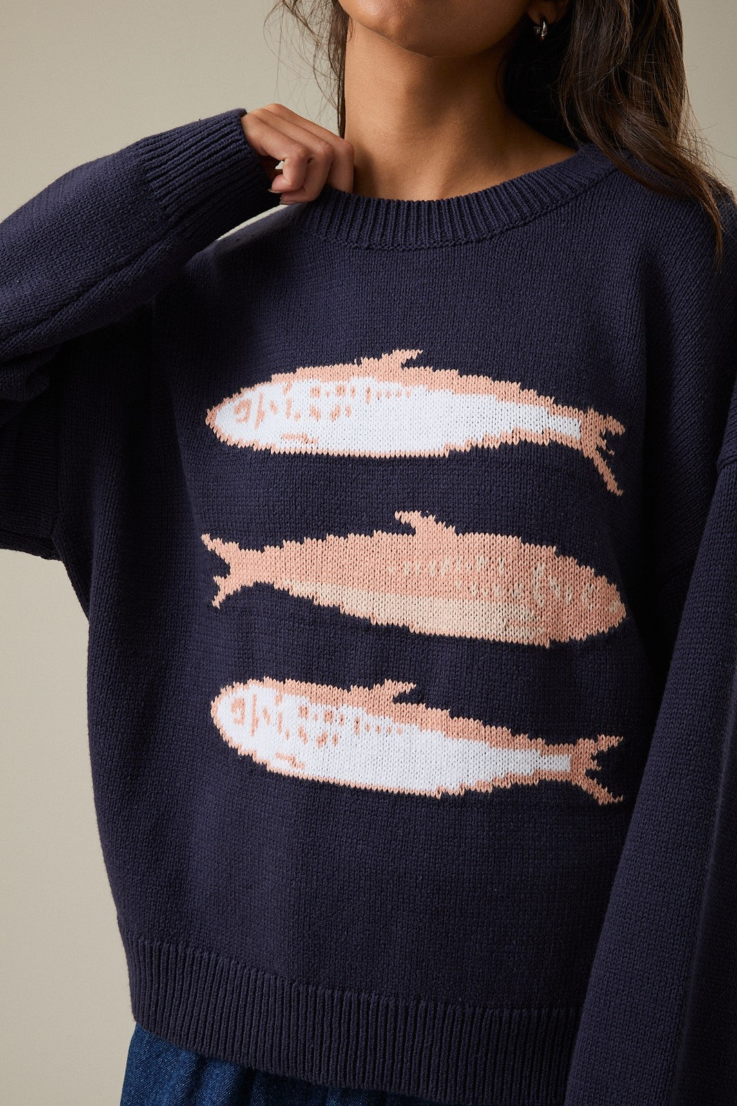 This navy sweater top features a playful sardine print that is sure to be a conversation starter!