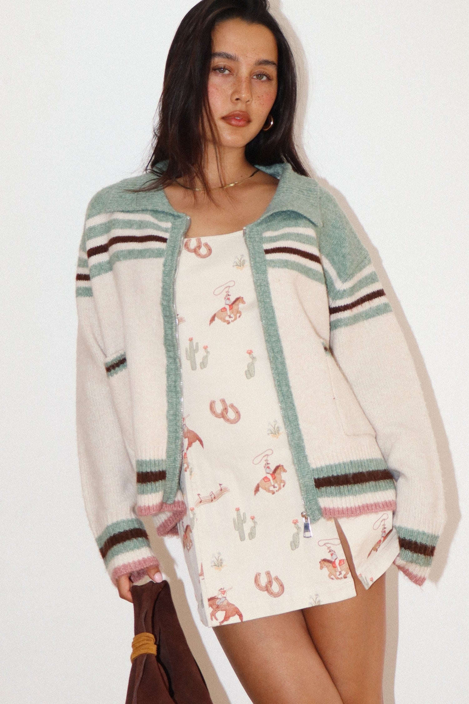 Your grandma's sweater but make it trendy. This lightweight, super soft zip-up sweater features a beige, green, brown and pink colour combination making it a great choice for transitioning into the next season. The cowboy design on the back is everything and more.