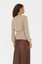 Wrap-style knitted cardigan in light beige with long sleeves and a deep V-neck. Features a tie belt at the waist and ribbed edges. Made from a soft, slightly textured fabric.