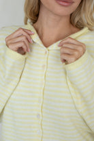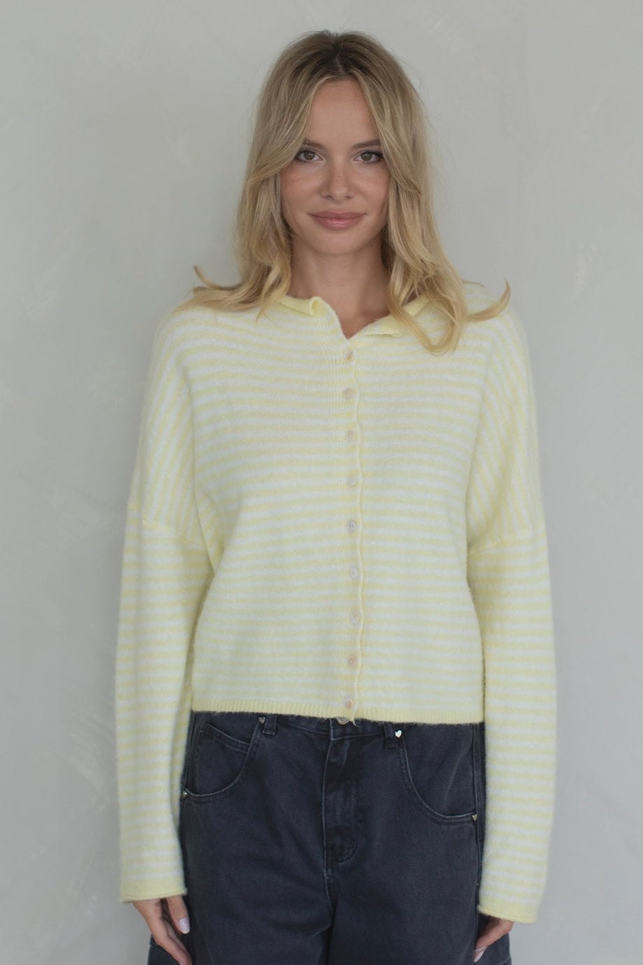 Soft and cozy cardigan in mini stripes - lightweight and rolled edge finish on the sleeves and collar.