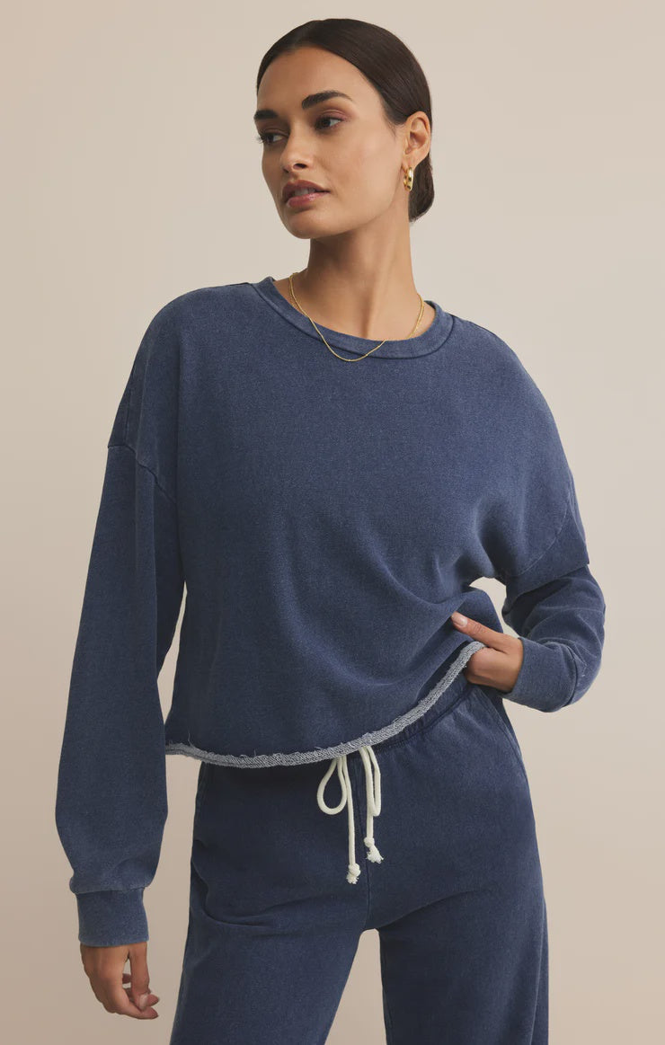 Crafted from knit denim french terry with a lived-in mineral wash, this relaxed crew has that just-right slouch and an edge of raw hem detailing, perfect for layering over leggings or pairing with matching bottoms.