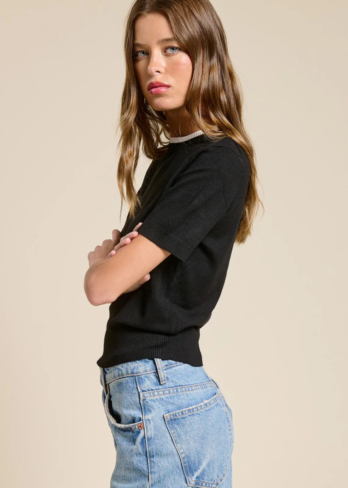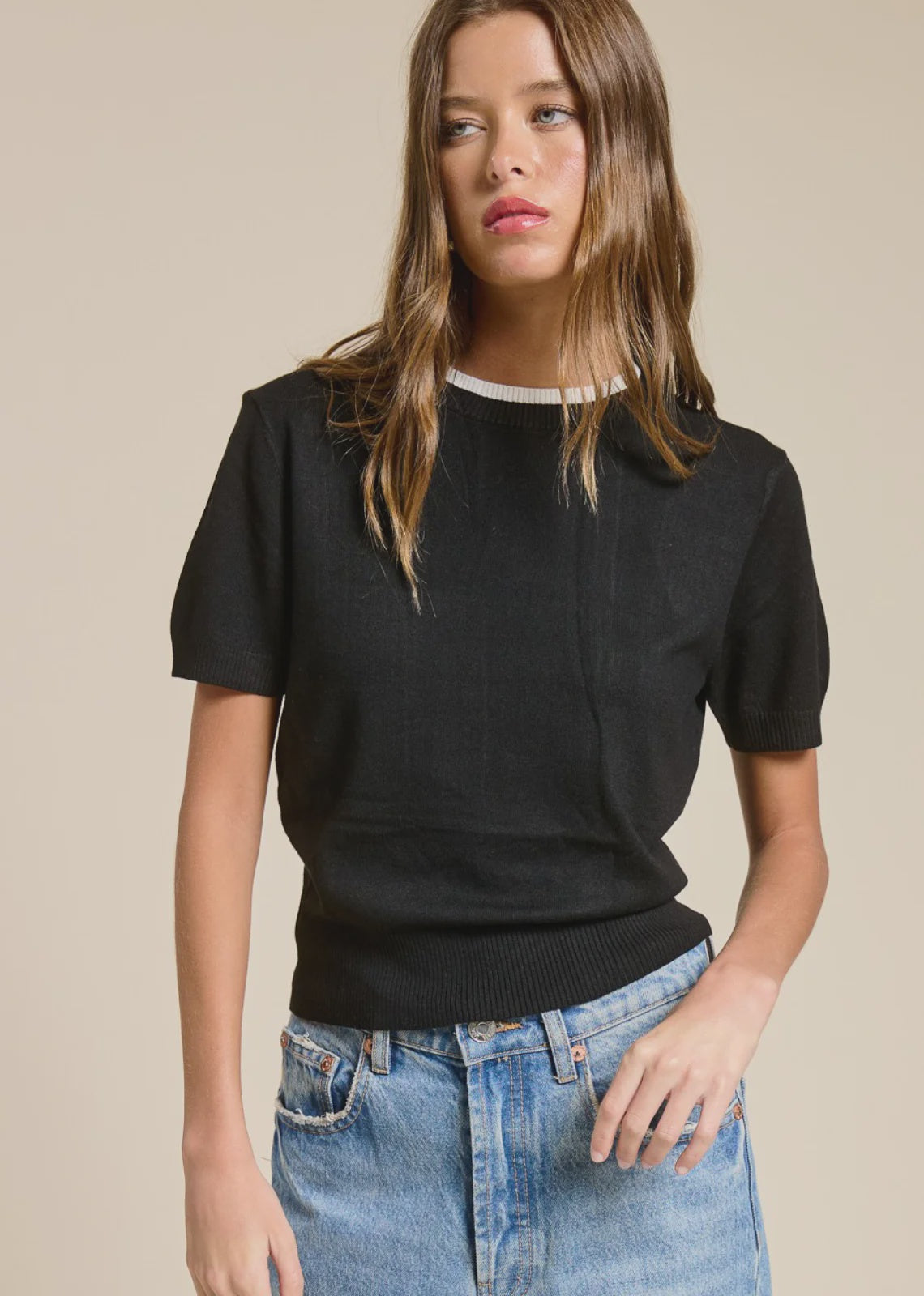 This refined knit tee is crafted from premium Viscose, offering a unique blend of subtle sheen, breathable weight, and a fluid drape. Featuring a contrast rib neckline and clean short sleeves, it balances casual comfort with a polished finish. A versatile piece ideal for elevated basics or transitional layering.
